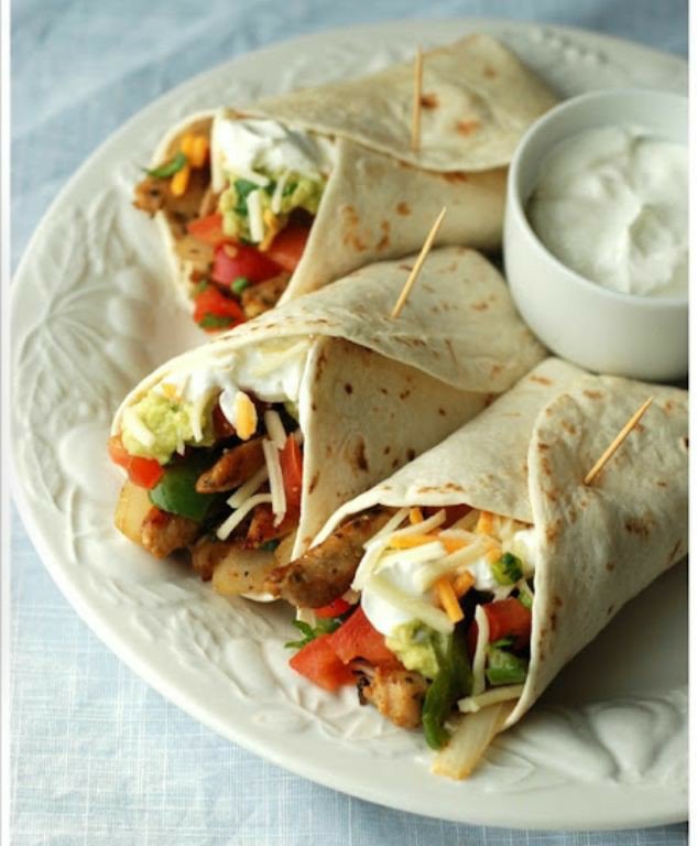 En una superficie plana colocas las tortillas, agregas la salsa bechamel, encima colocas la mezcla de pechuga, carne y pimentones, luego agregas el guacamole, y un poco de cilantro. Cierras las tortillas como en forma de rollo ayudandote del palillo para que no se abran. Puedes agregar un poco de queso encima.