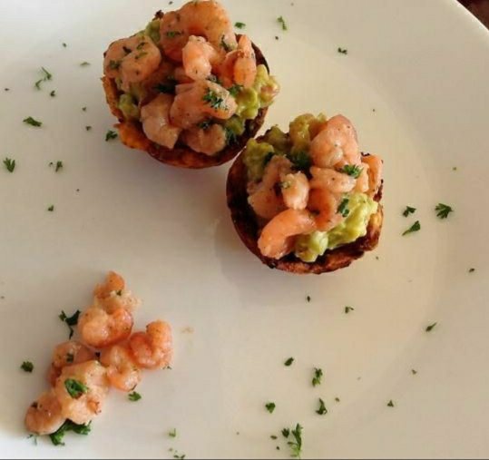 Listo, servimos los patacones en un plata y en la superficie de estos agregamos un poco de guacamole y encima ponemos algunos camarones.