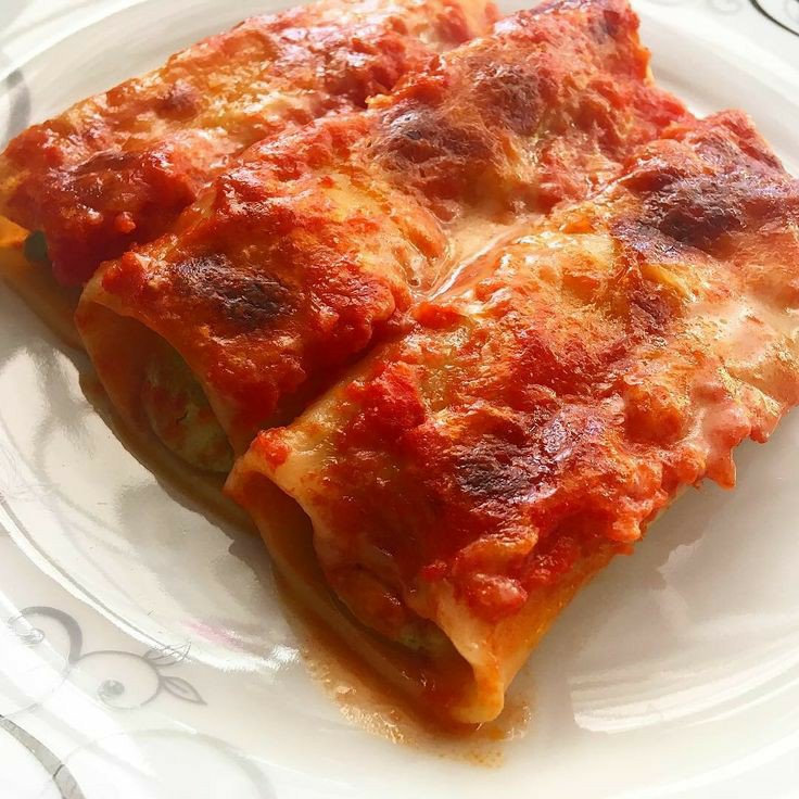 - Cuando tengamos todos los rollos, engrasados un molde para hornear con aceite o mantequilla en la superficie y a los lados para que los cannelloni no se peguen. Una vez los rollos en el molde, agregamos salsa al gusto encima de estos y encima de la salsa queso parmesano y horneamos de 40 a 45 min o hasta que el queso dore.